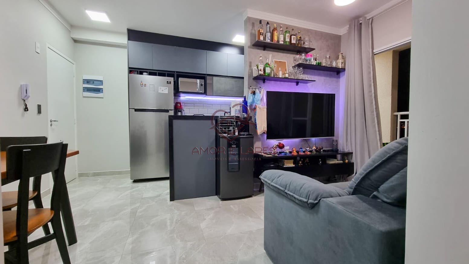 Lindo apartamento de 2 dormitórios sendo 1 suíte, cozinha rica em planejados com cooktop e forno embutido, lavanderia com armário separada da cozinha por uma divisória, sala com bancada ilha que integra com a cozinha, sacada e 1 vaga de garagem coberta.