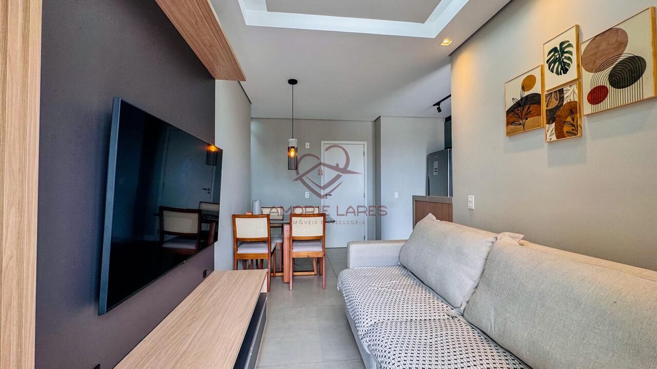 Apartamento à venda com 2 dormitórios, sendo 1 suíte com armários planejados, além de 1 banheiro social. A cozinha possui armários planejados, cooktop e forno. A sala conta com painel de TV, e a varanda oferece uma pia, infraestrutura para ar-condicionado e de instalação de churrasqueira.