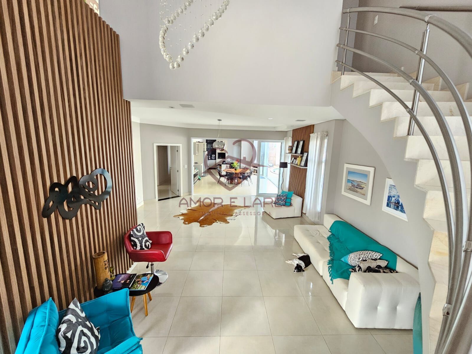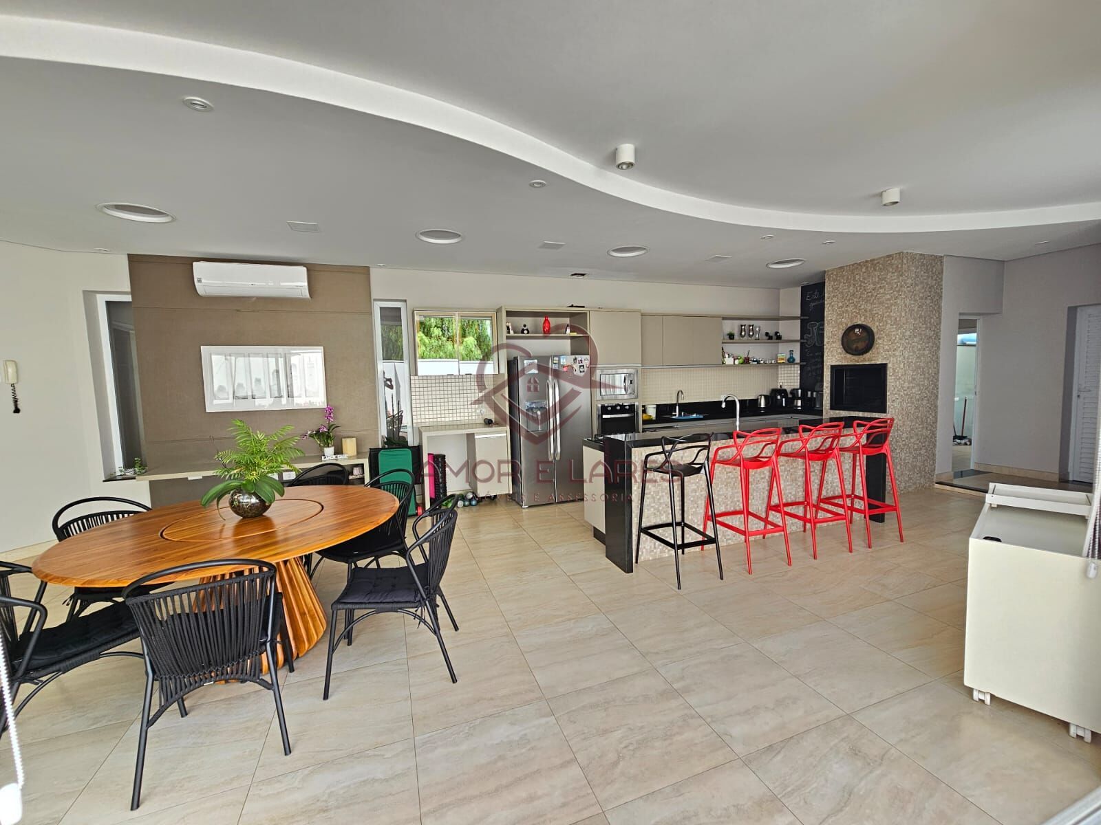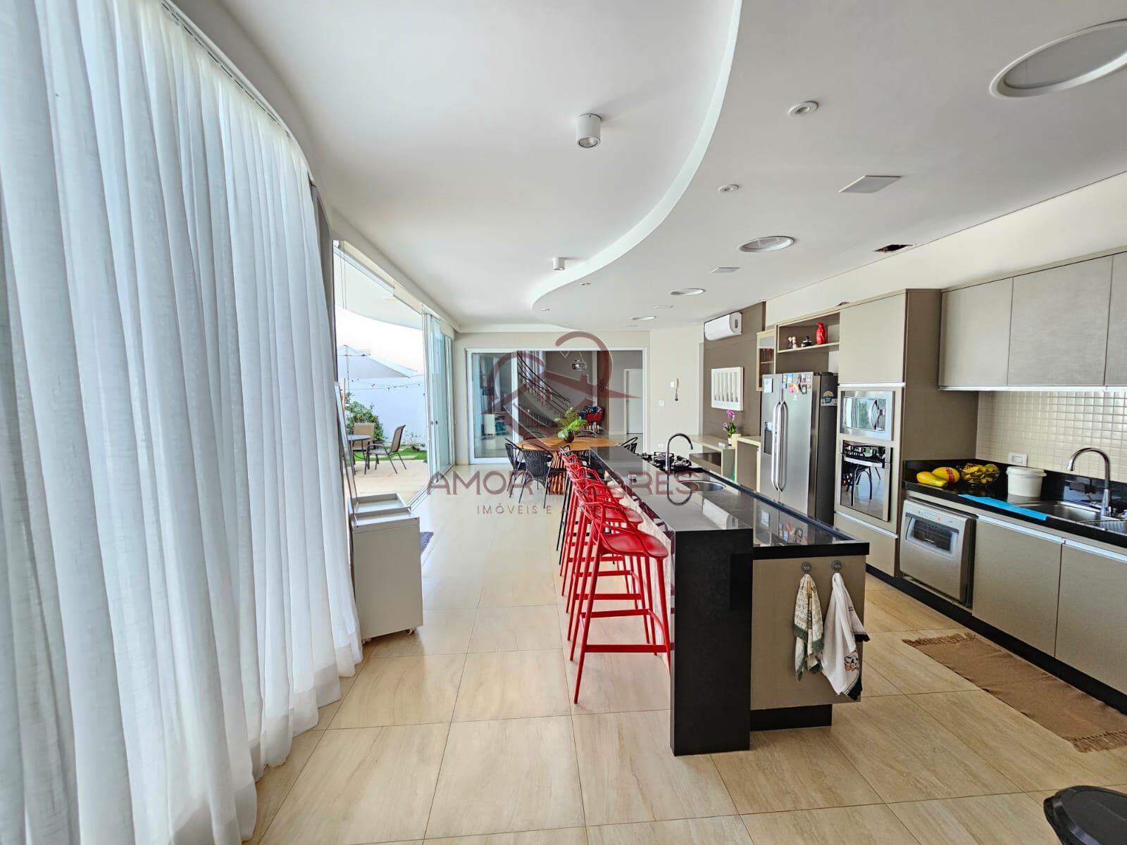 Possui sala de estar ampla, sala de TV e lavabo. A cozinha é espaçosa, equipada com churrasqueira, bancada em granito e armários embutidos. Na área externa, destaca-se a piscina com luz de LED, aquecimento e cascata, perfeita para momentos de lazer.
