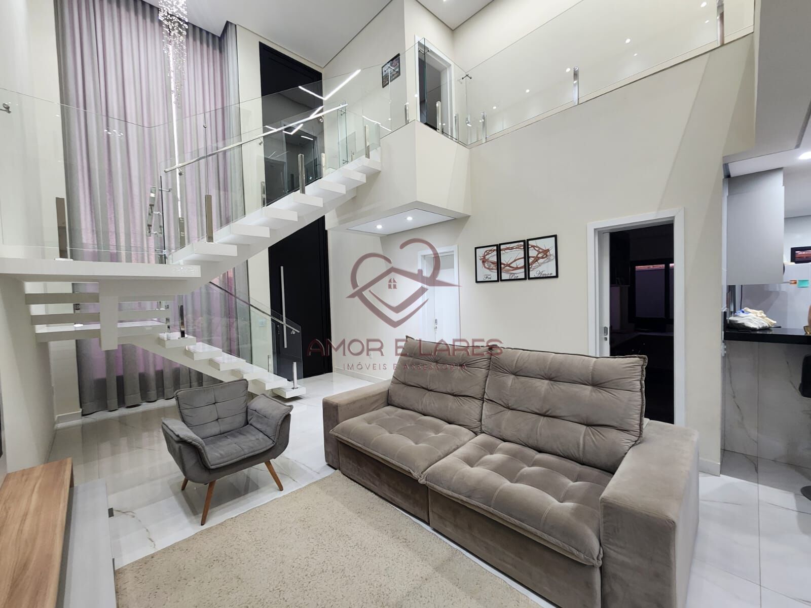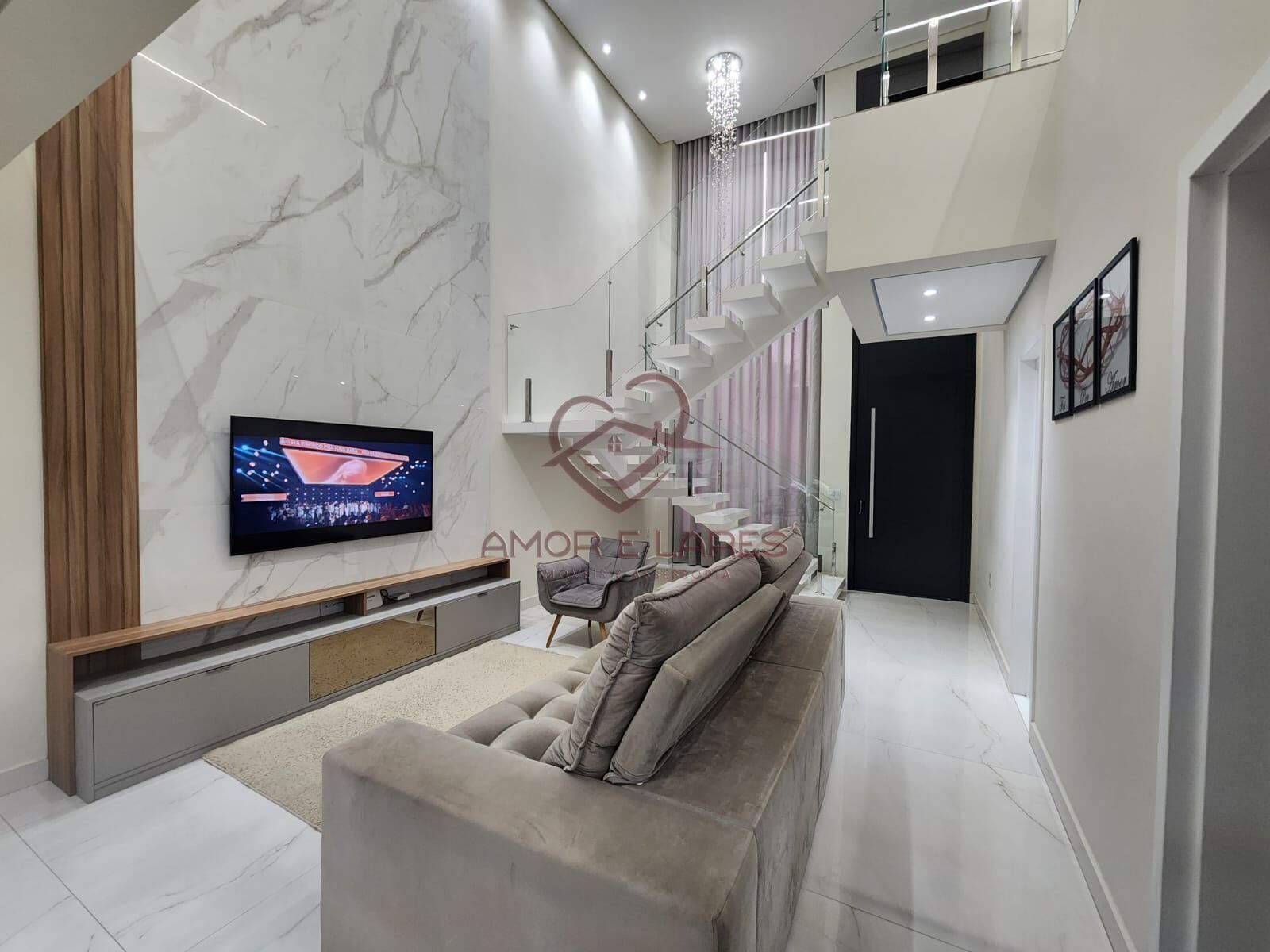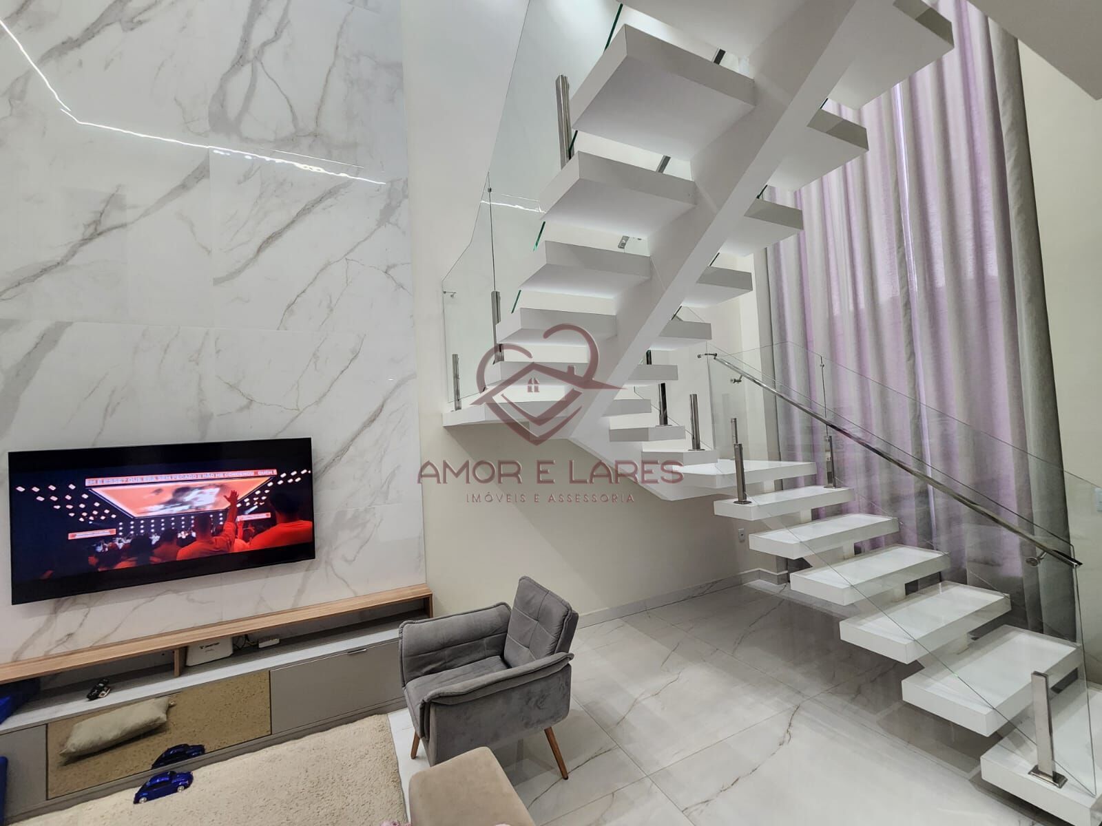 Casa à venda com 3 dormitórios, sendo 1 suíte master com closet, equipado com portas reflecta, enquanto os outros 2 dormitórios também contam com armários planejados. A sala principal é ampla, com pé direito alto, rack com painel ripado e acabamento em porcelanato até o teto, e a sala de jantar conta com lustre.