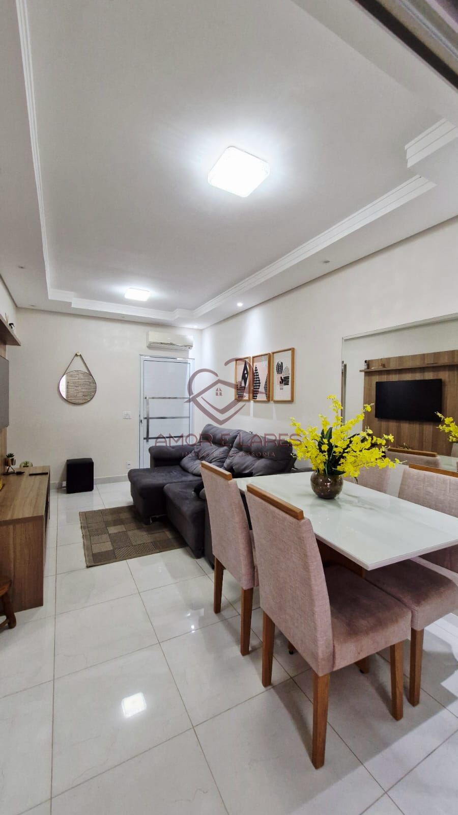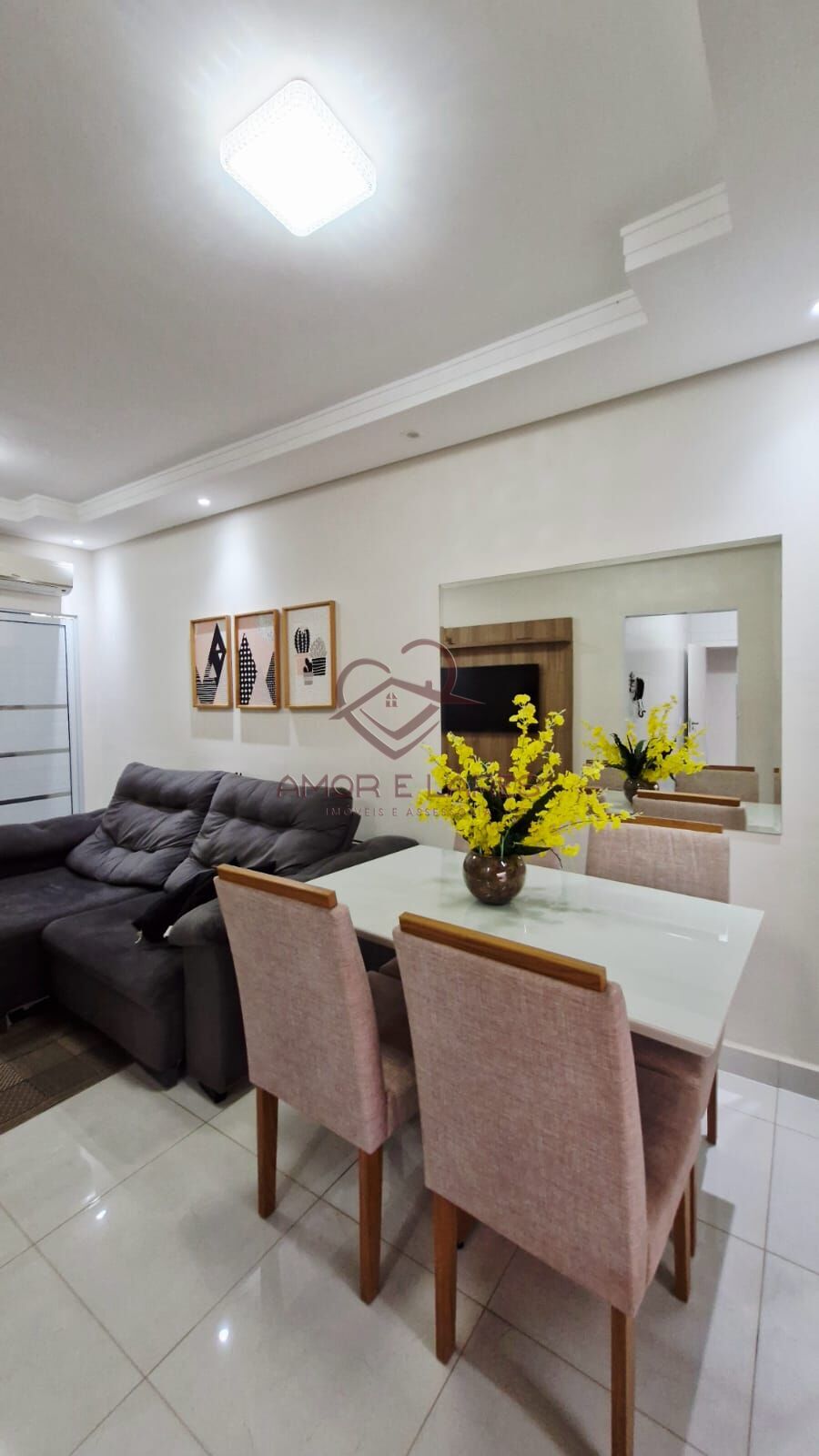 As salas de estar e jantar são integradas, com painel, espelho, porta em blindex e ar-condicionado. A cozinha com armários planejados, pia em granito e bancada prática.